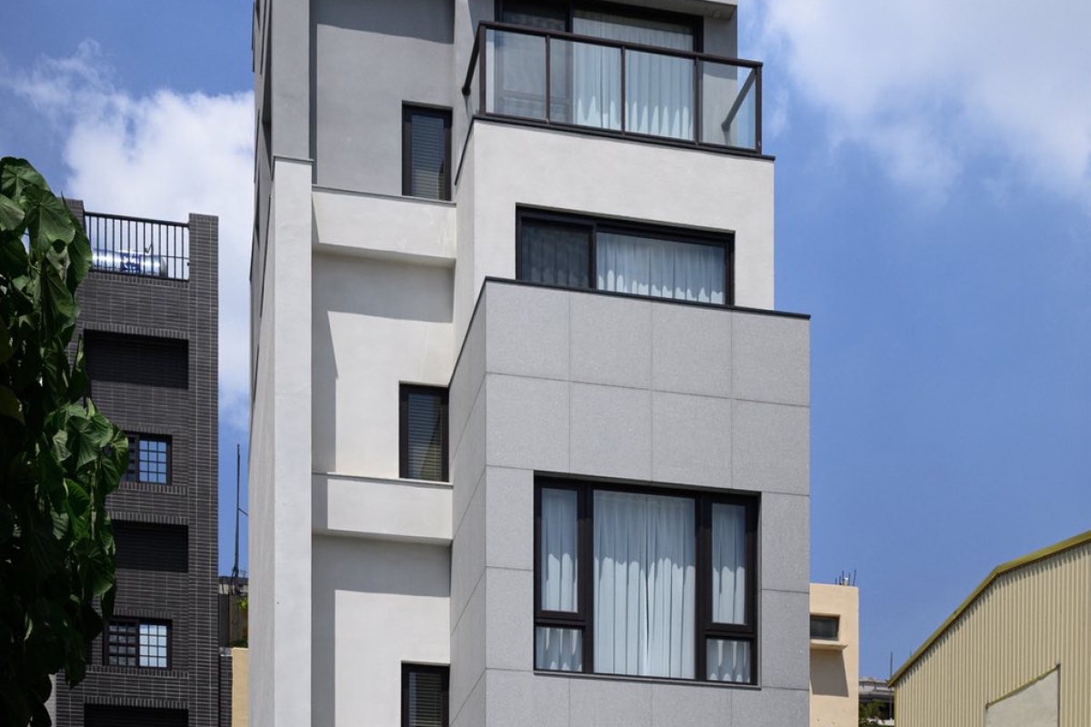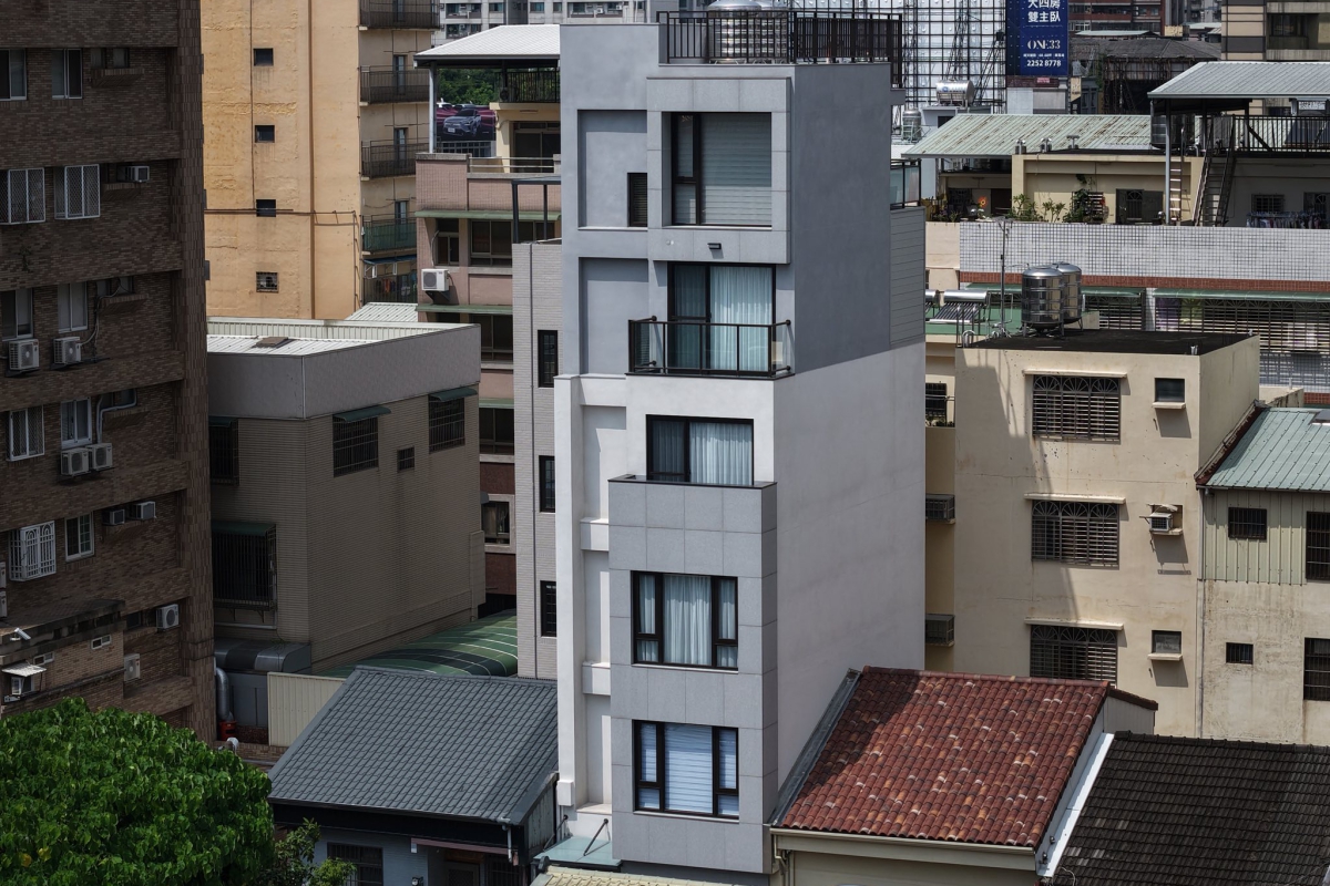 本案位於都市緊密街廓之中,基地面積狹小而深長。建築師以「垂直生活」為設計核心,將建築量體向上發展,形成一棟新加坡式獨棟透天住宅。外觀以石材與塗料為主要材質,透過簡潔的立面比例與開窗節奏,呈現現代住宅的純淨感與秩序性。